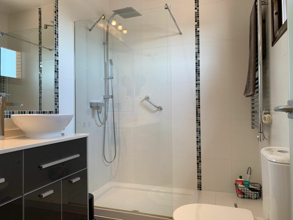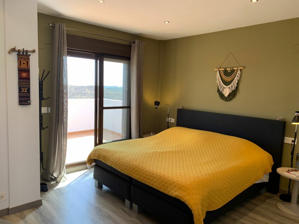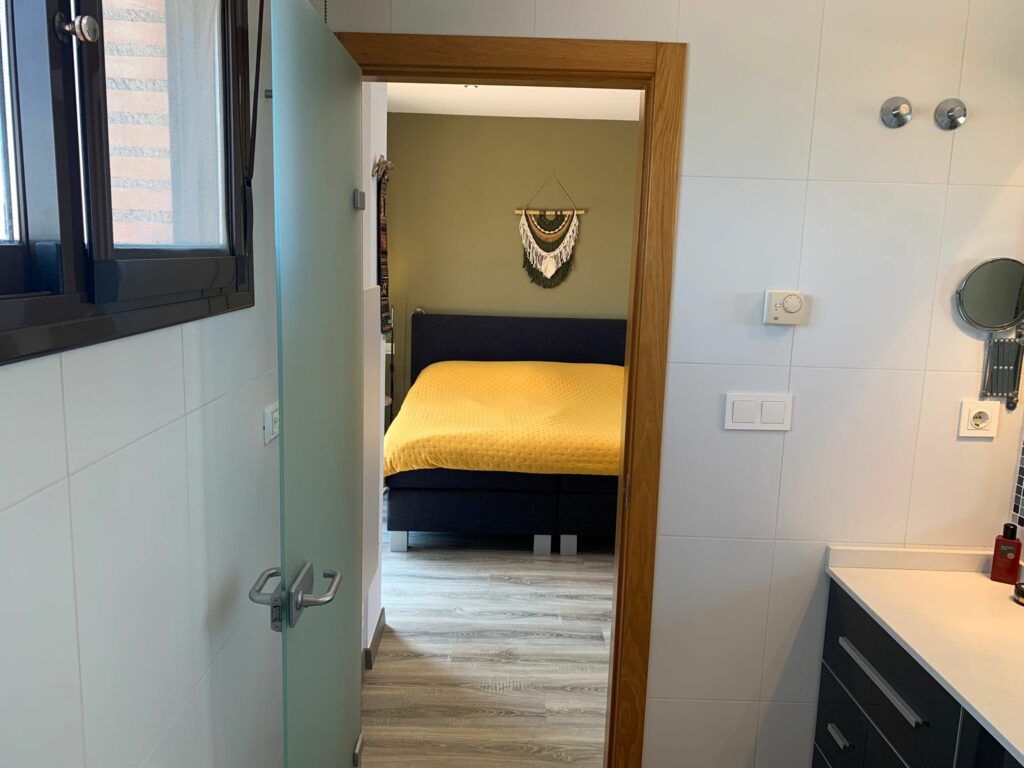 If you go back to the stairs and go up one floor, you will enter the large master bedroom with en-suite bathroom and a spacious bathroom. A long built-in wardrobe allows you to store all your clothes. The bathroom has a spacious walk-in shower, sink and toilet. From this bedroom you have access to the huge terrace where you can sit and relax on sultry summer nights. Under the stars and with the magnificent view already described.