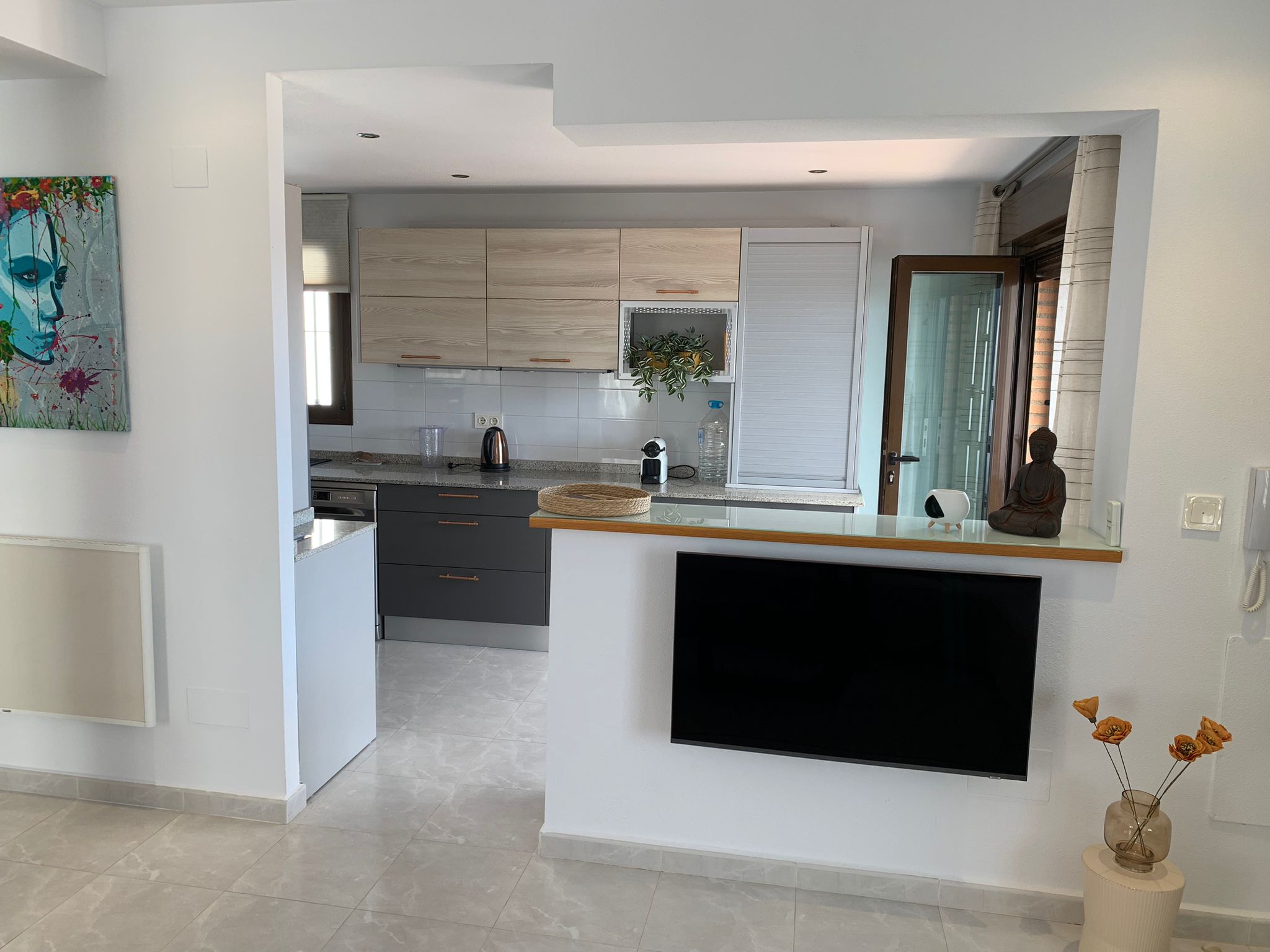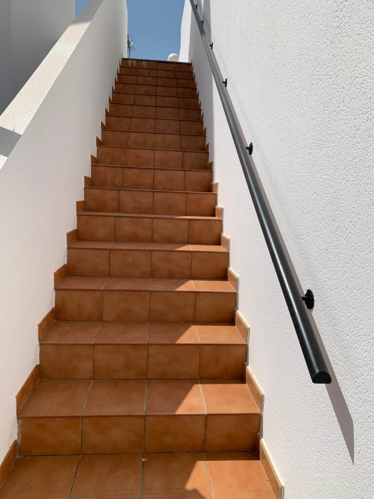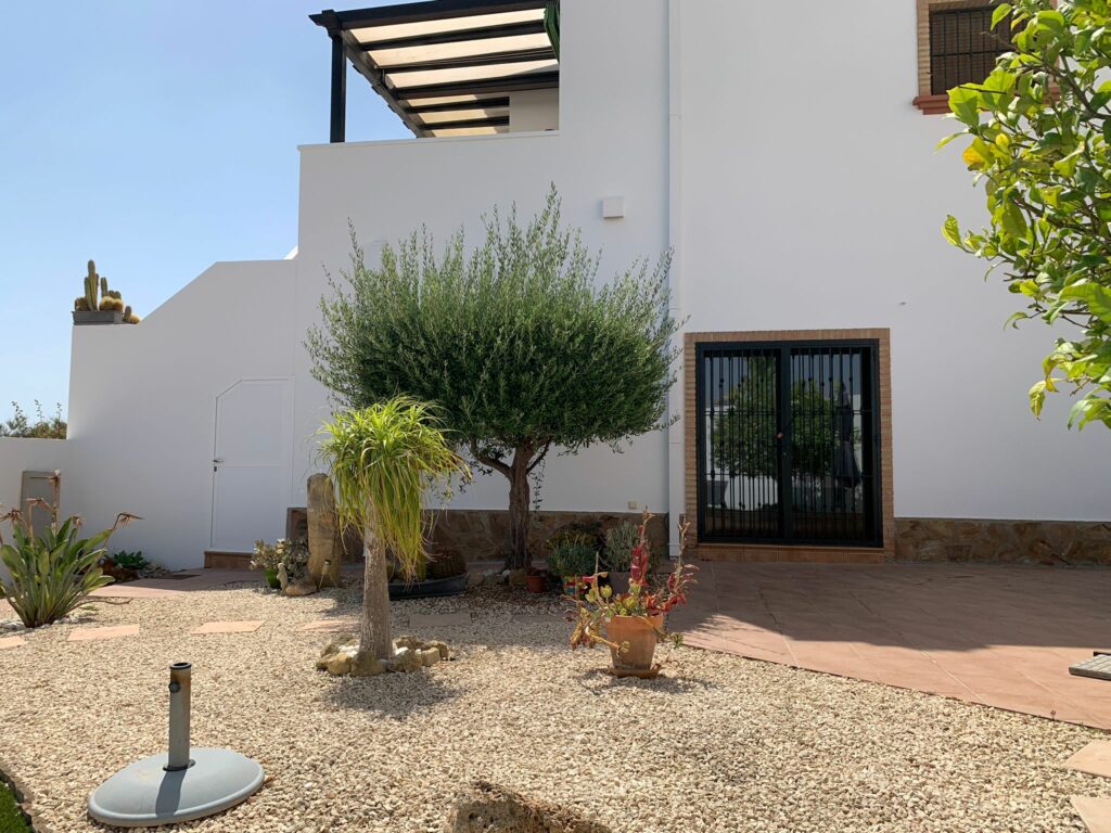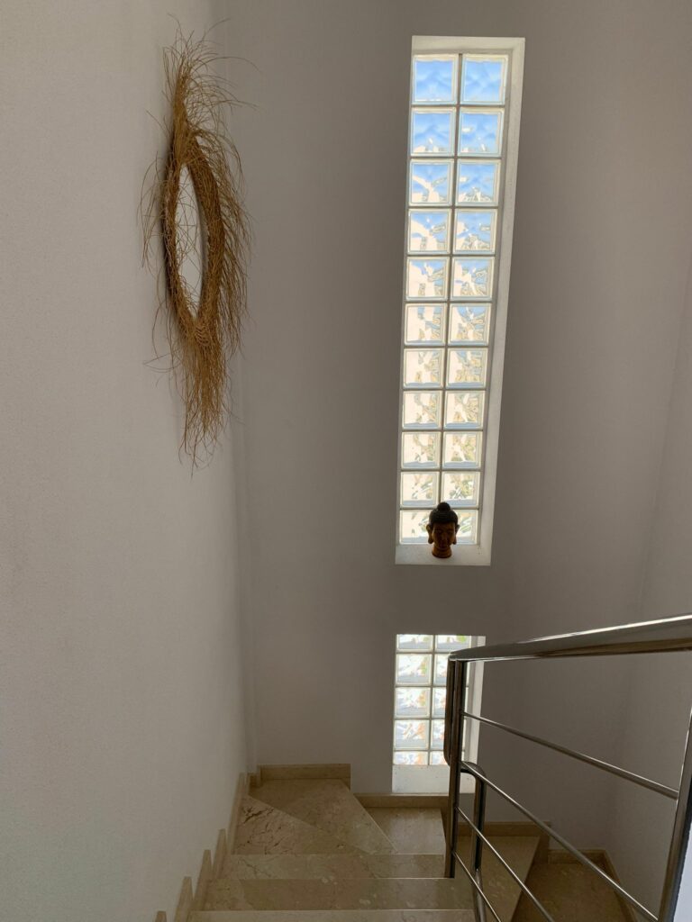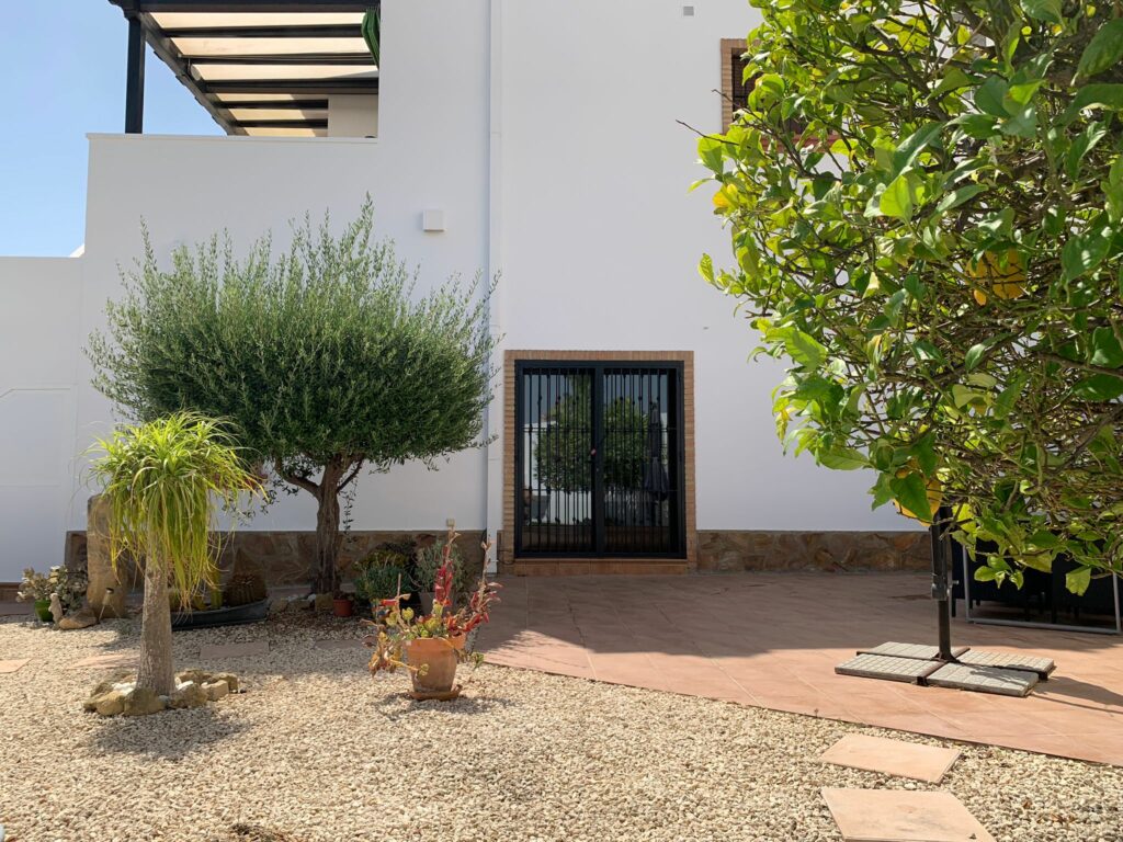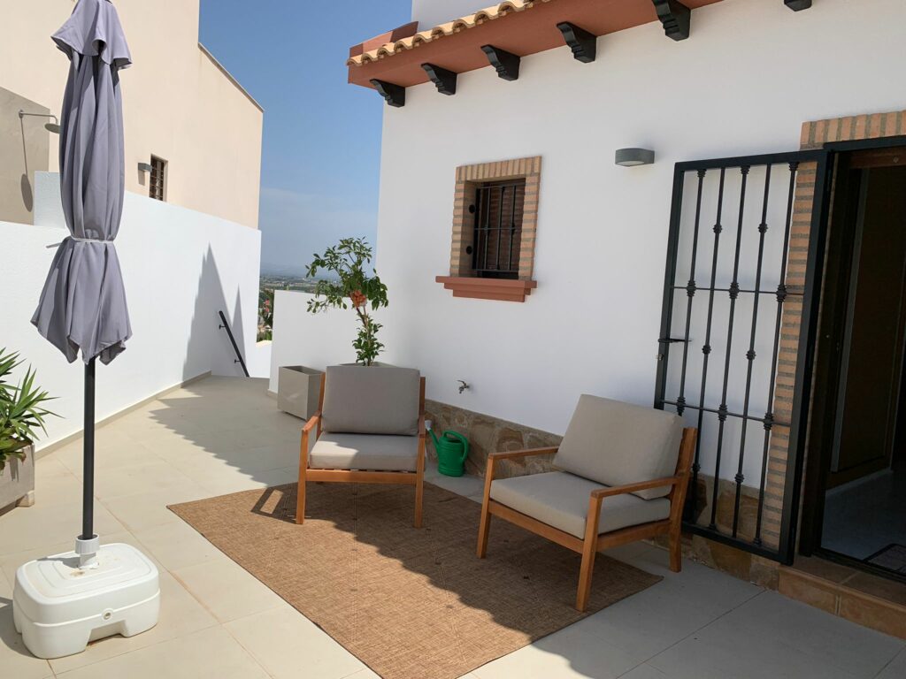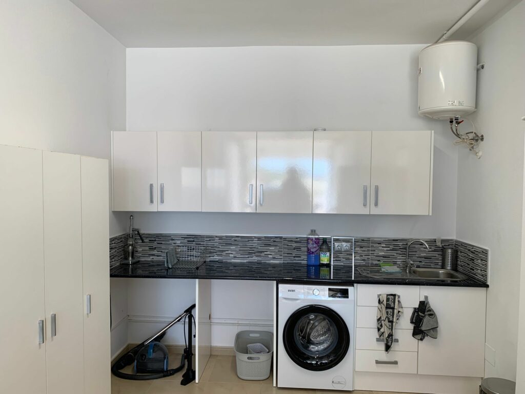 You walk up the bright staircase to the first floor. On the right a bathroom with shower, sink and toilet. Straight ahead is a small bedroom with wardrobe which also gives access to the rear terrace. On the left you enter the spacious living room through a glass door. A very spacious living room by Spanish standards with a dining area and a sitting area by the TV. From the living room you enter the semi-open kitchen with many meters of worktop and all built-in appliances (fridge and freezer; dishwasher and two ovens). The front door is near the living room, but you won’t use it much.