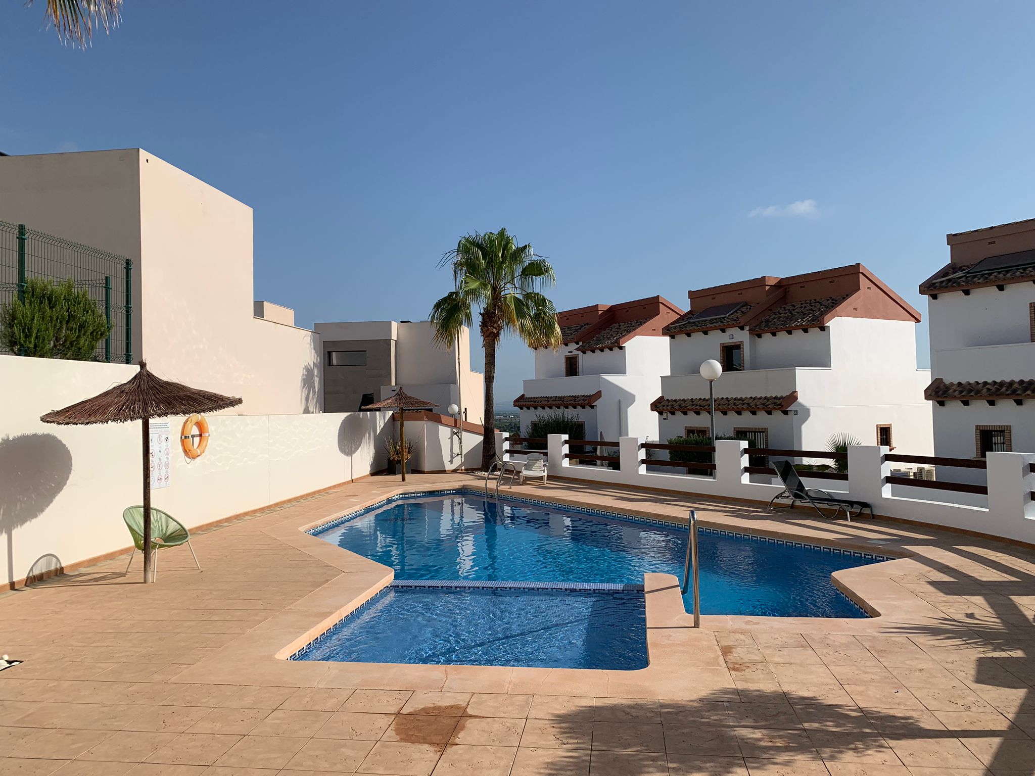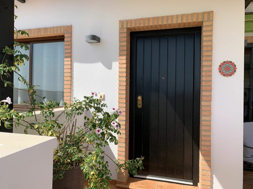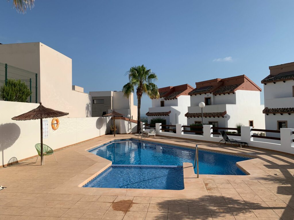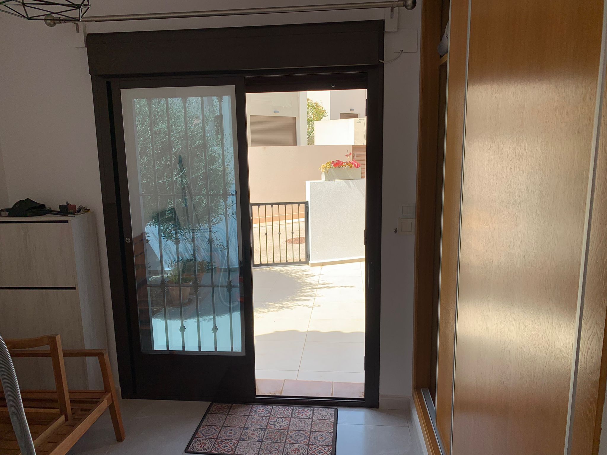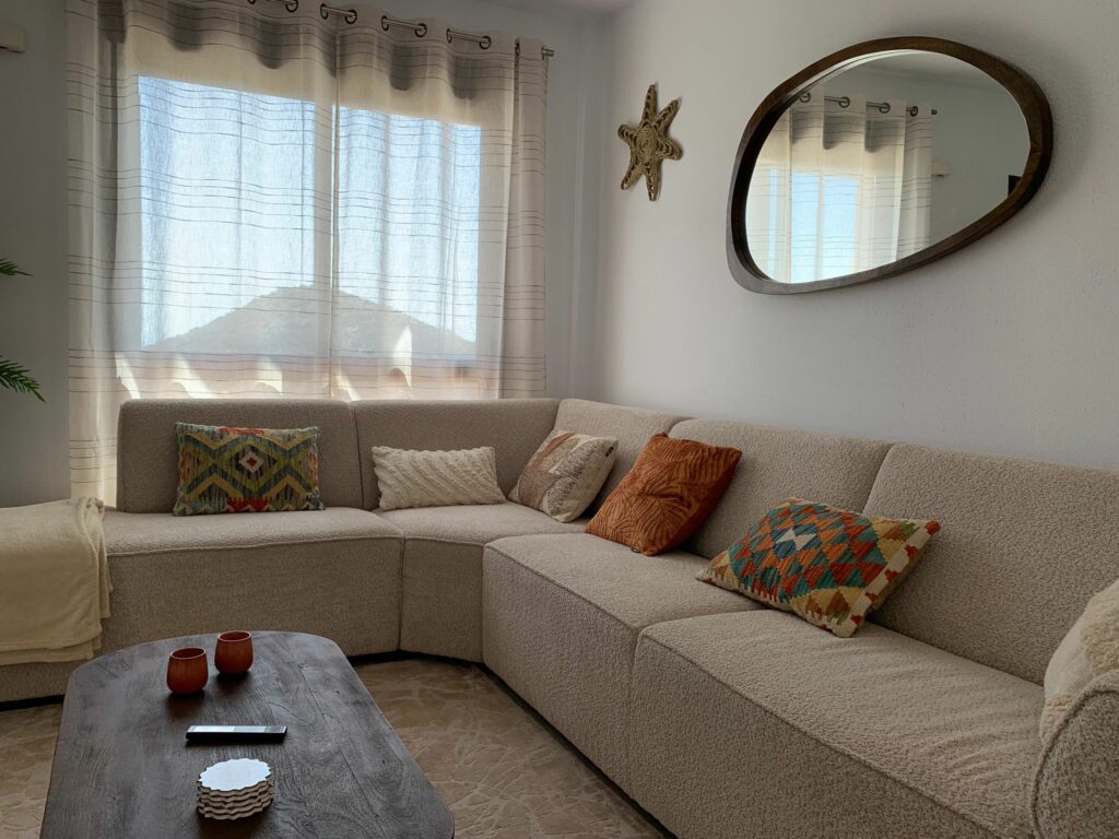 You walk up the bright staircase to the first floor. On the right a bathroom with shower, sink and toilet. Straight ahead is a small bedroom with wardrobe which also gives access to the rear terrace. On the left you enter the spacious living room through a glass door. A very spacious living room by Spanish standards with a dining area and a sitting area by the TV. From the living room you enter the semi-open kitchen with many meters of worktop and all built-in appliances (fridge and freezer; dishwasher and two ovens). The front door is near the living room, but you won’t use it much.