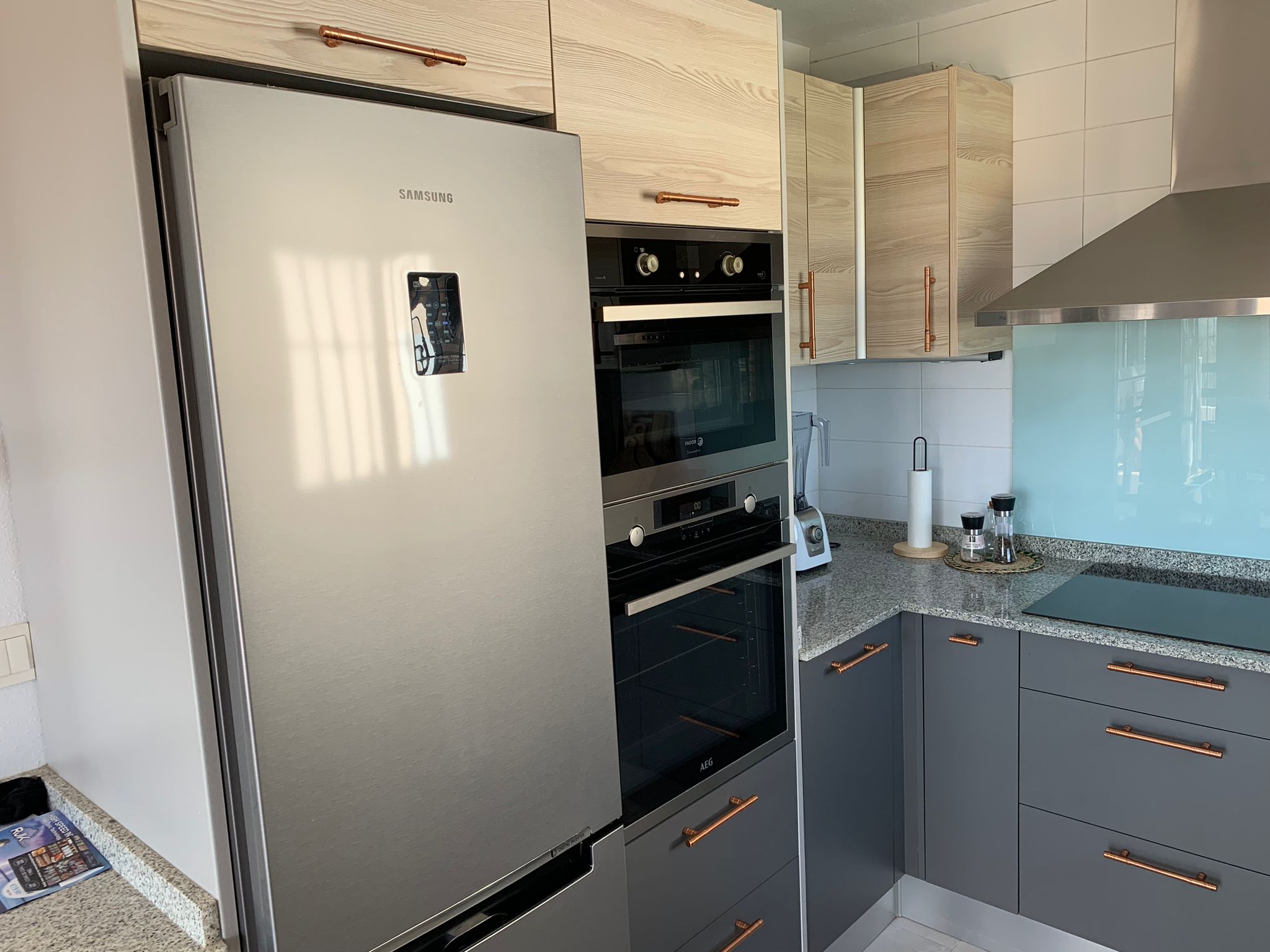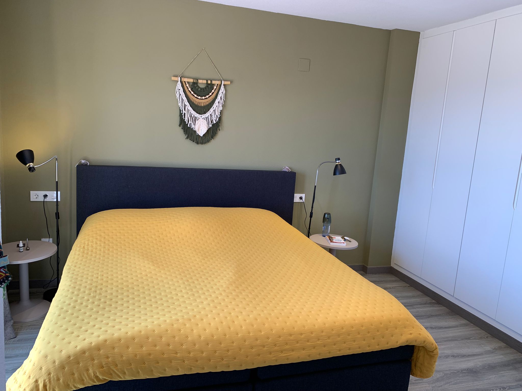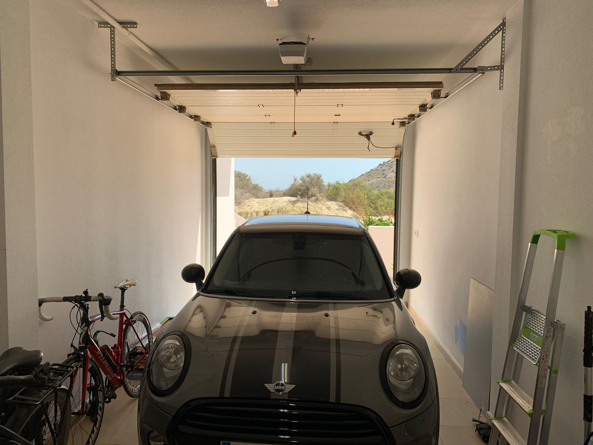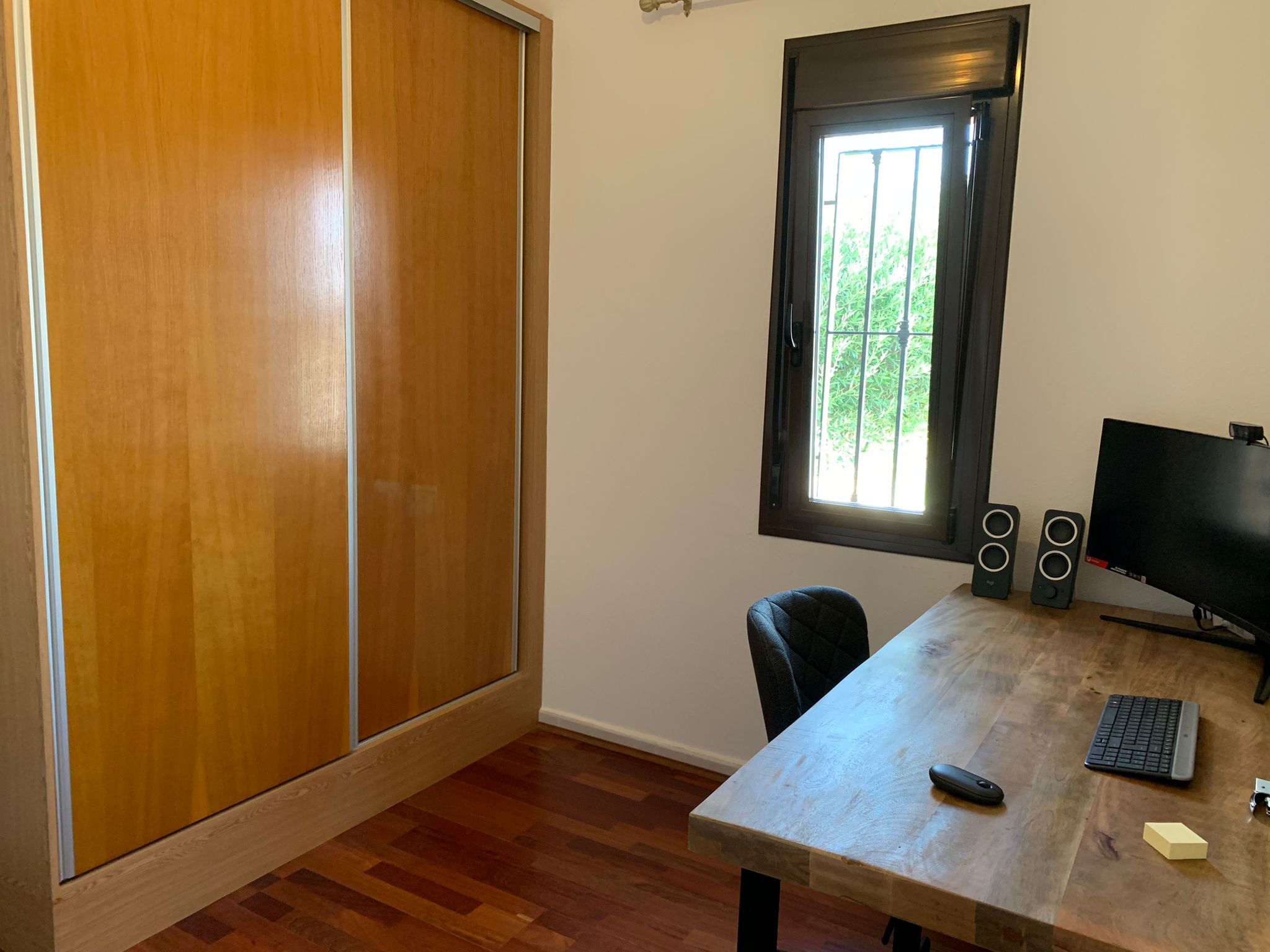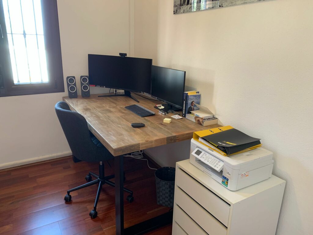 You walk up the bright staircase to the first floor. On the right a bathroom with shower, sink and toilet. Straight ahead is a small bedroom with wardrobe which also gives access to the rear terrace. On the left you enter the spacious living room through a glass door. A very spacious living room by Spanish standards with a dining area and a sitting area by the TV. From the living room you enter the semi-open kitchen with many meters of worktop and all built-in appliances (fridge and freezer; dishwasher and two ovens). The front door is near the living room, but you won’t use it much.