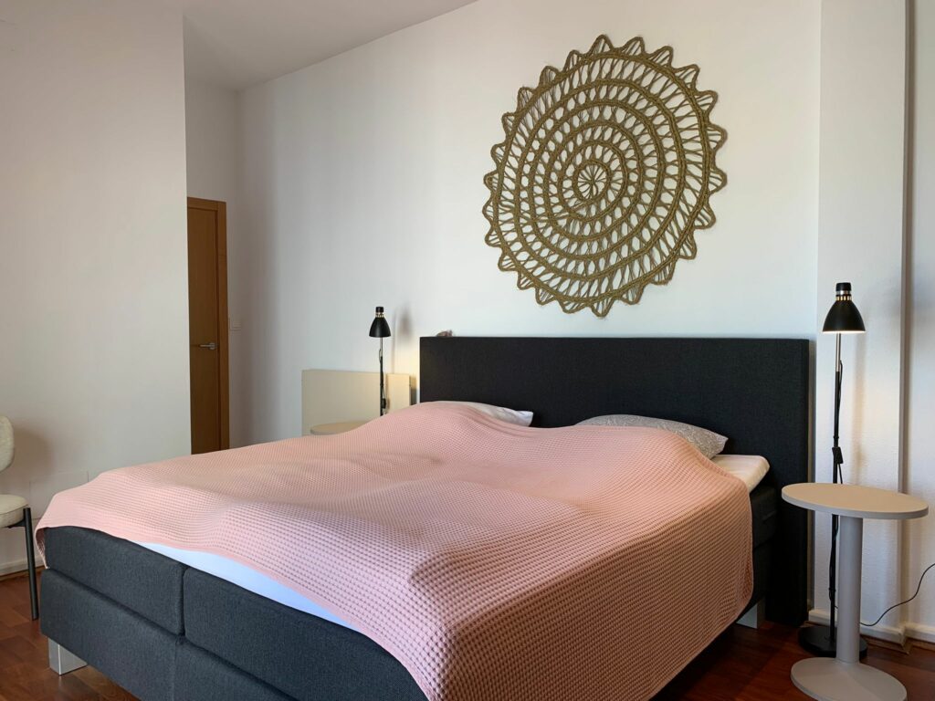 Through a fire door you enter the stairwell on the right from the garage. On the left a bathroom with bath, sink and guest toilet and on the right a very large double guest bedroom with a spacious wardrobe. This room has patio doors to the spacious garden (shade side) of the house. Behind this bedroom is another study, but it can also be set up as a second bedroom on this floor.